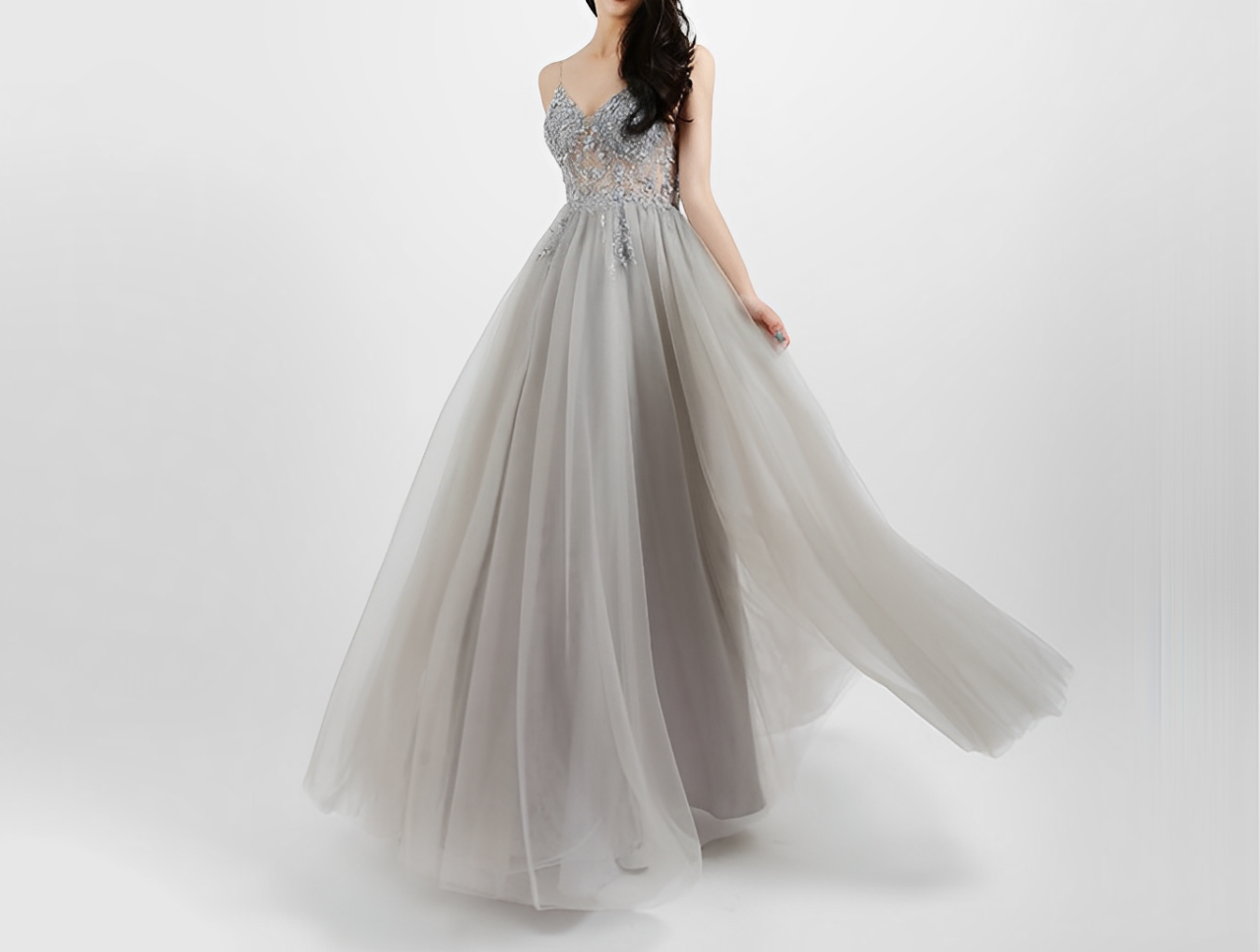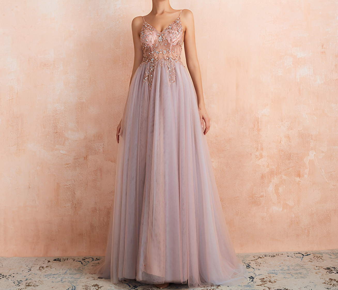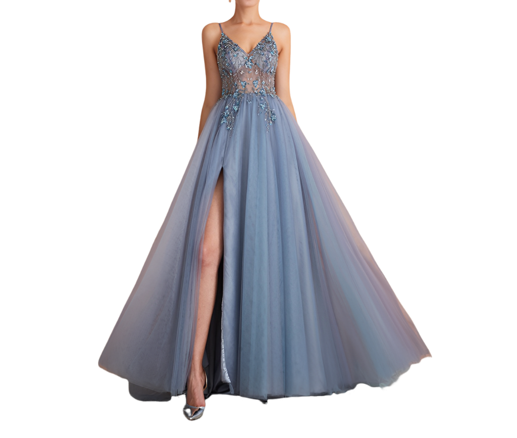 Elegant balklänning med spaghettiband, broderade detaljer och en luftig tyllkjol. Djup slits ger en sofistikerad touch. Perfekt för gala, bröllop och fest. Kombinera med klackar och smycken för en lyxig look.