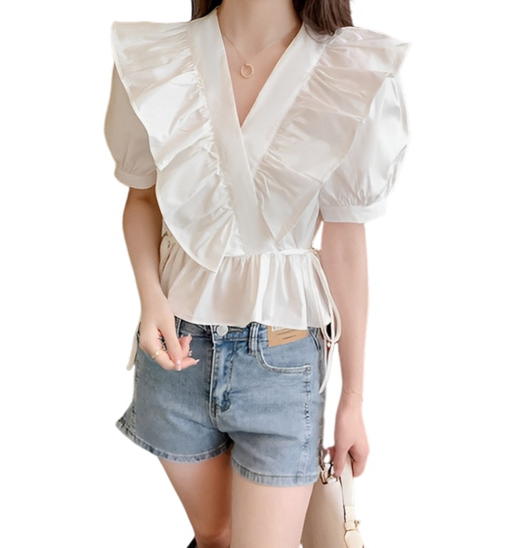Selma™ is the perfect blouse for when you want to combine elegance with summery ease. Designed in a shiny, soft fabric that subtly catches the light, it has a fold-over wrap look with a v-neck that flatters the bust. The puffed sleeves create a modern, feminine silhouette while the wide ruffles at the front add volume and character.