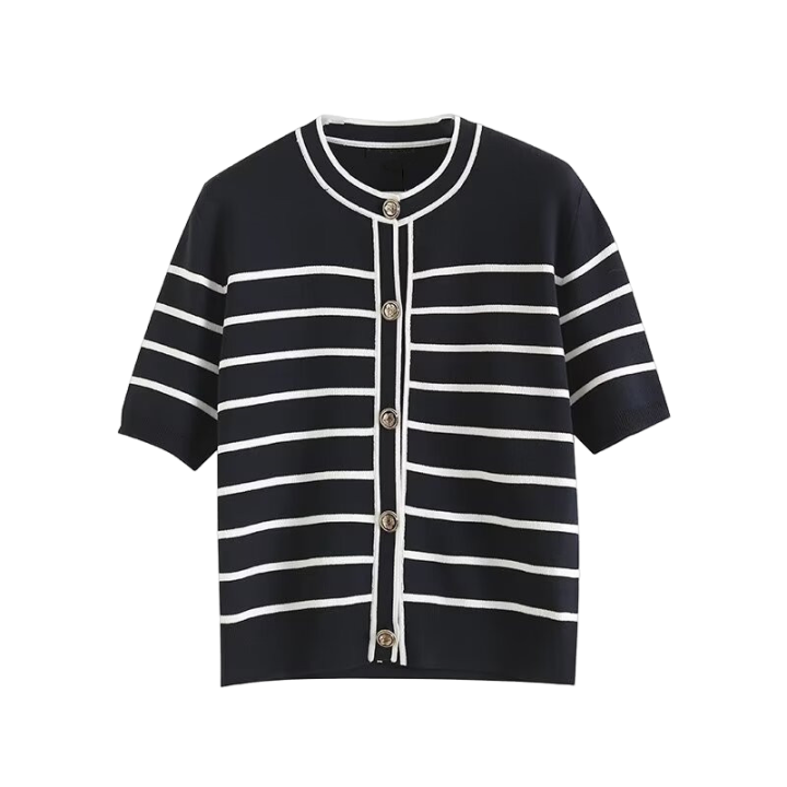 Denna kortärmade kofta med randigt mönster och eleganta guldknappar kombinerar klassisk och modern stil. Perfekt för varma dagar eller lager-på-lager, den ger en stilren och sofistikerad touch till din vardagslook.