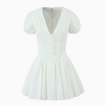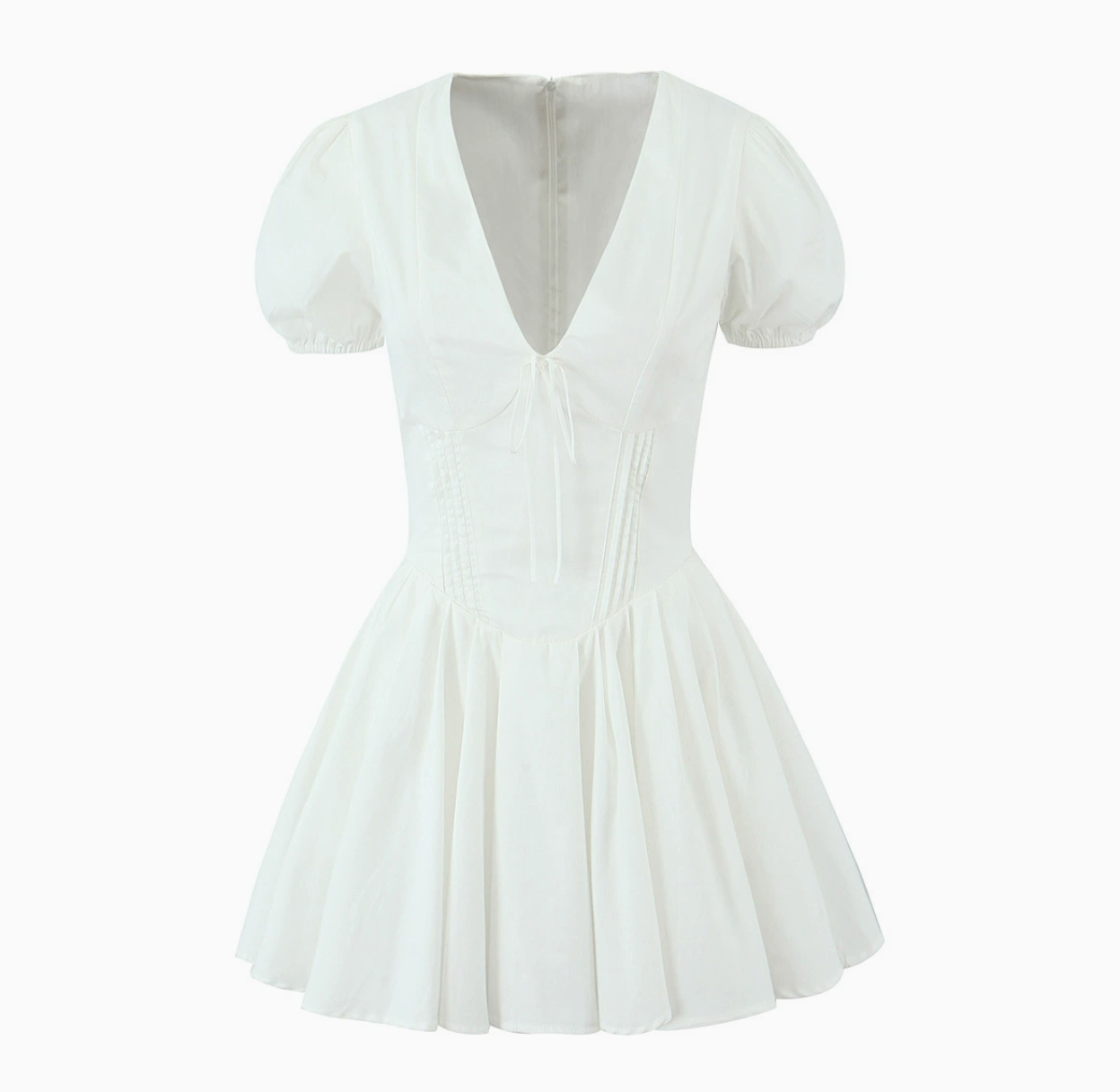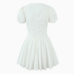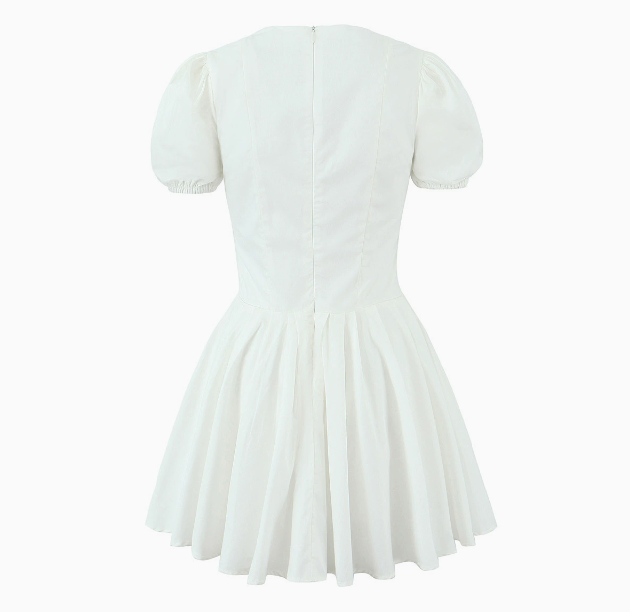 White babydoll dress with puff sleeves and a flared skirt. The fitted waist enhances the silhouette, while the soft pleats create a playful feel.