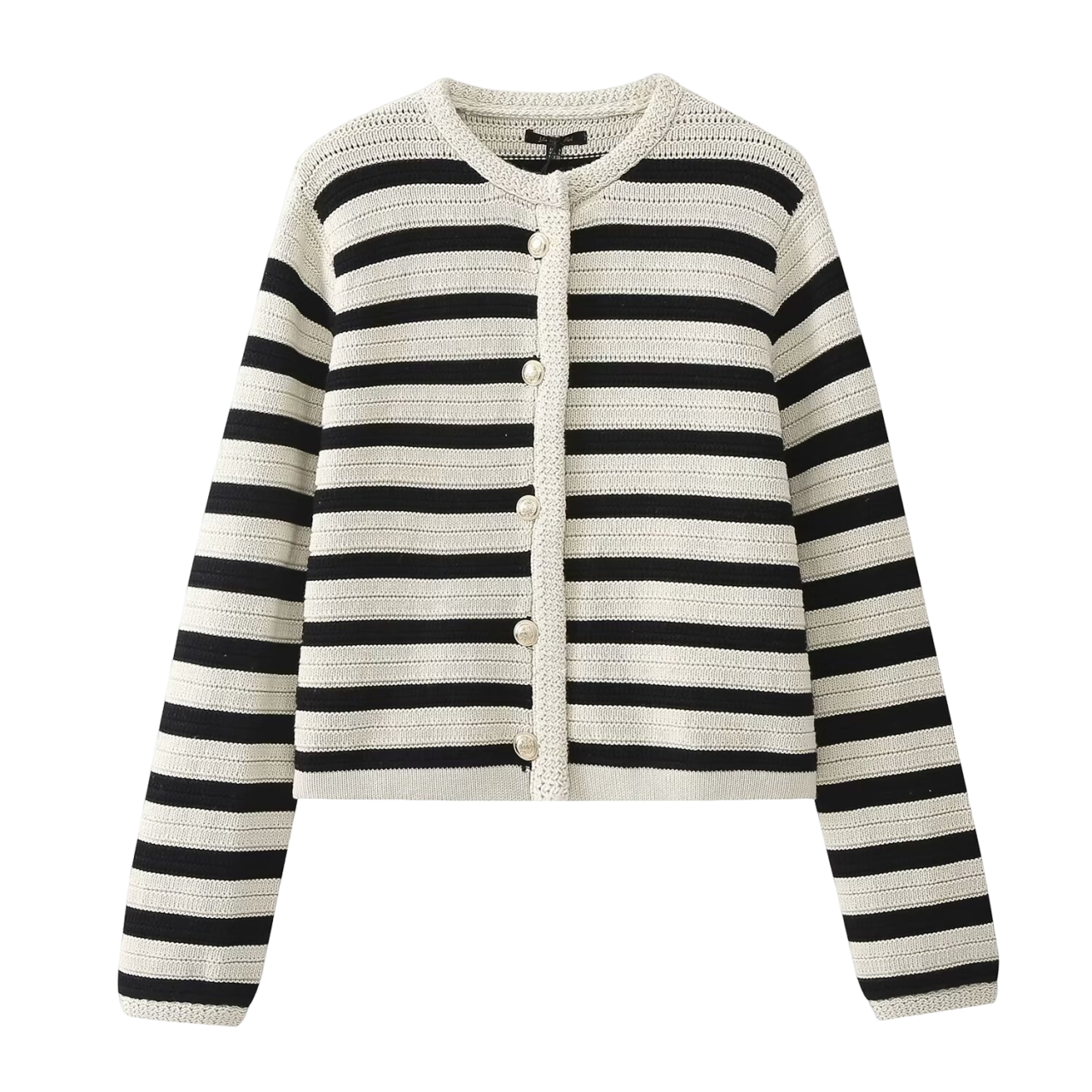 This elegant striped cardigan with pearl buttons combines classic style with modern design. The soft knit makes it a versatile and stylish garment that is suitable for both everyday and party wear.