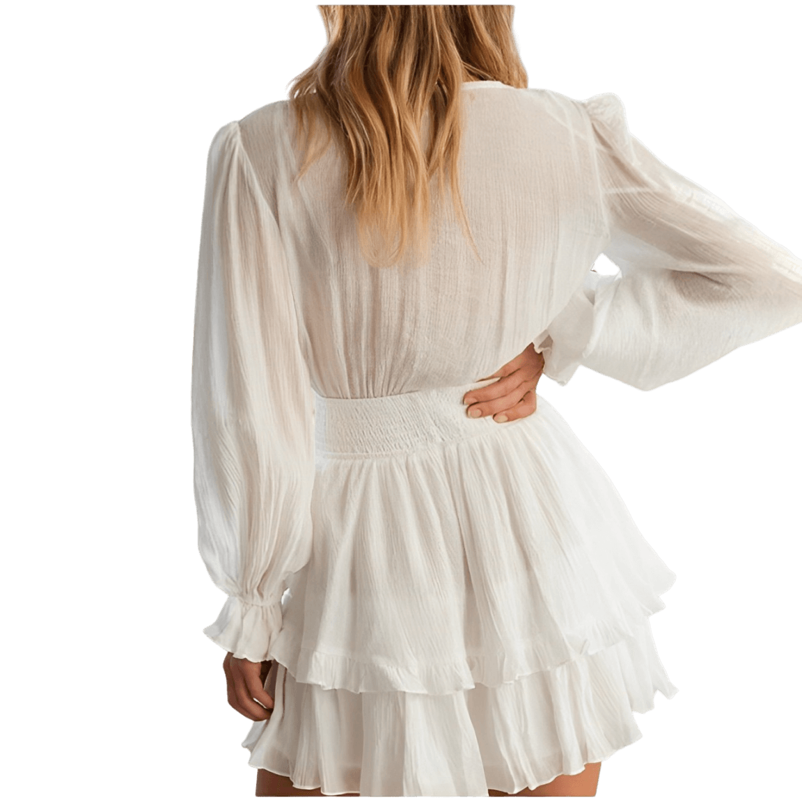 Lina™ tilbyr en sofistikert volangkjole med V-hals og lange puffermer, for en tidløs sjarm. Det luftige designet gir en følelse av frihet, perfekt for varme sommerkvelder.